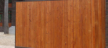 Гаражные ворота могут быть выполнены из сэндвич-панелей любых оттенков, фактур. Имитирование панели под дерево с помощью модели - панели "филенка". Максимальный эффект достигается при использовании сэндвич - панелей цвета "Золотой дуб" или «Темный орех» с рисунком под дерево).